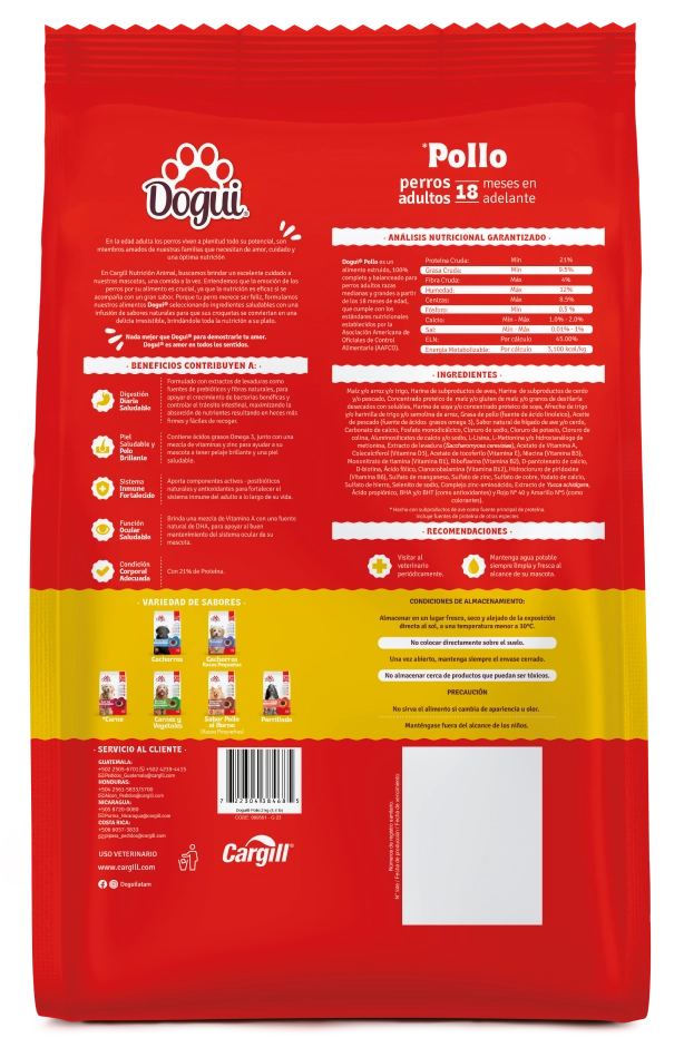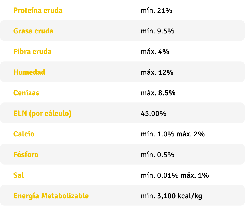 Maíz y/o arroz y/o trigo, Harina de subproductos de aves, Harina de subproductos de cerdo y/o pescado, Concentrado proteico de maíz y/o gluten de maíz y/o granos de destilería desecados con solubles, Harina de soya y/o concentrado proteico de soya, Afrecho de trigo y/o harinilla de trigo y/o semolina de arroz, Grasa de pollo (fuente de ácido linoleico), Aceite de pescado (fuente de ácidos grasos omega 3), Sabor natural de hígado de ave y/o cerdo, Carbonato de calcio, Fosfato monodicálcico, Cloruro de sodio, Cloruro de potasio, Cloruro de colina, Aluminosilicatos de calcio y/o sodio, L-Lisina, L-Metionina y/o hidroxianálogo de metionina, Extracto de levadura (Saccharomyces cerevisiae), Acetato de Vitamina A, Colecalciferol (Vitamina D3), Acetato de tocoferilo (Vitamina E), Niacina (Vitamina B3), Mononitrato de tiamina (Vitamina B1), Riboflavina (Vitamina B2), D-pantotenato de calcio, D-biotina, Ácido fólico, Cianocobalamina (Vitamina B12), Hidrocloruro de piridoxina (Vitamina B6), Sulfato de manganeso, Sulfato de zinc, Sulfato de cobre, Yodato de calcio, Sulfato de hierro, Selenito de sodio, Complejo zinc-aminoácido, Extracto de Yucca schidigera, Ácido propiónico, BHA y/o BHT (como antioxidantes) y Rojo N° 40 y Amarillo N°5 (como colorantes).